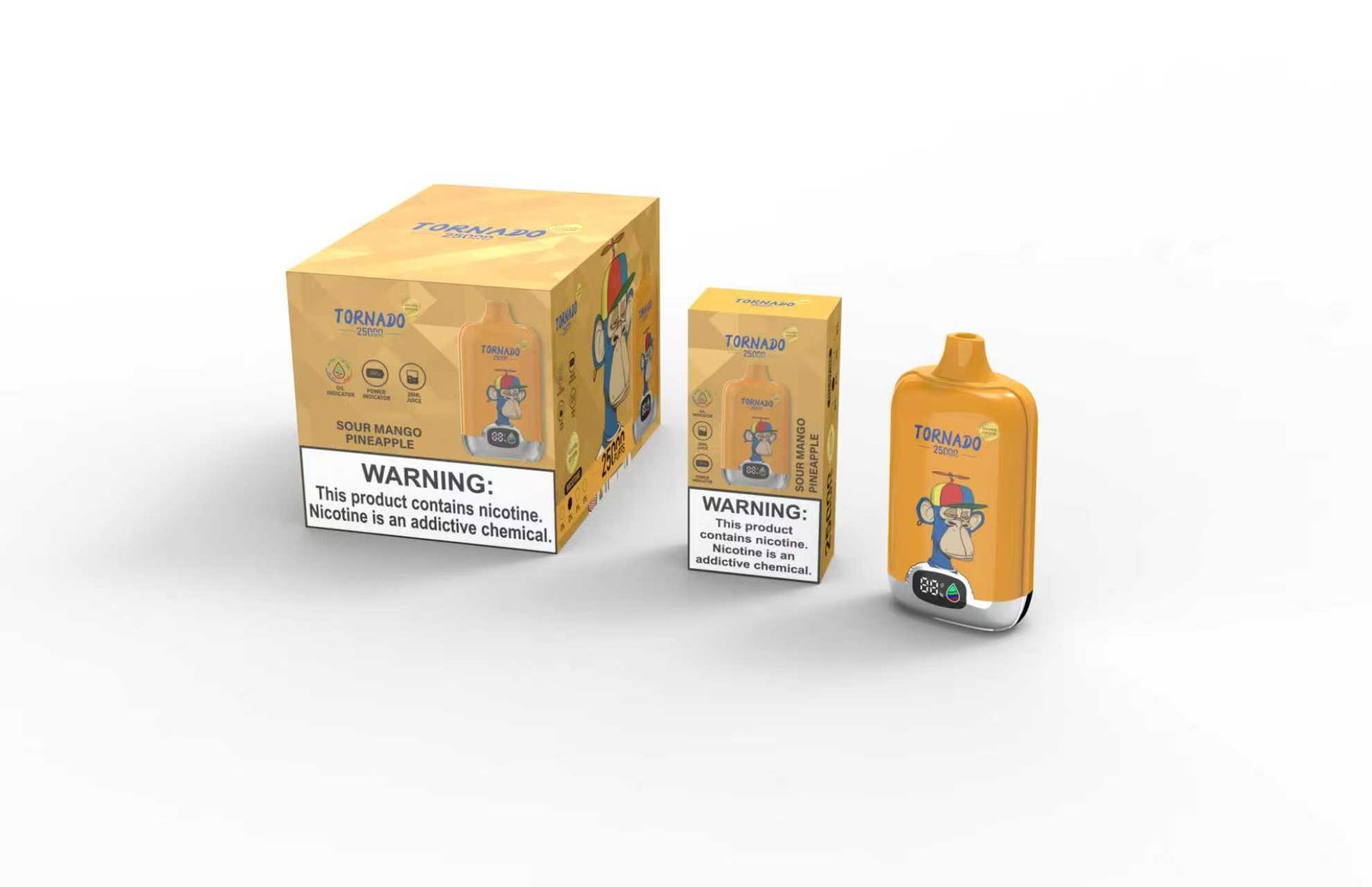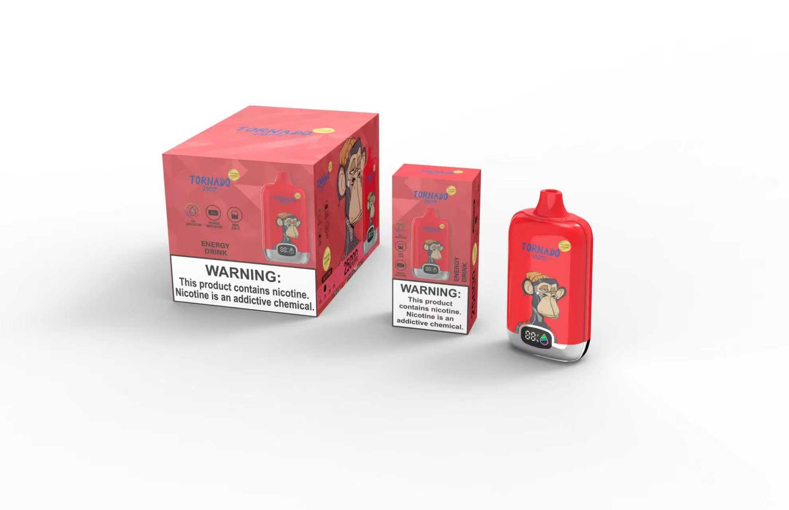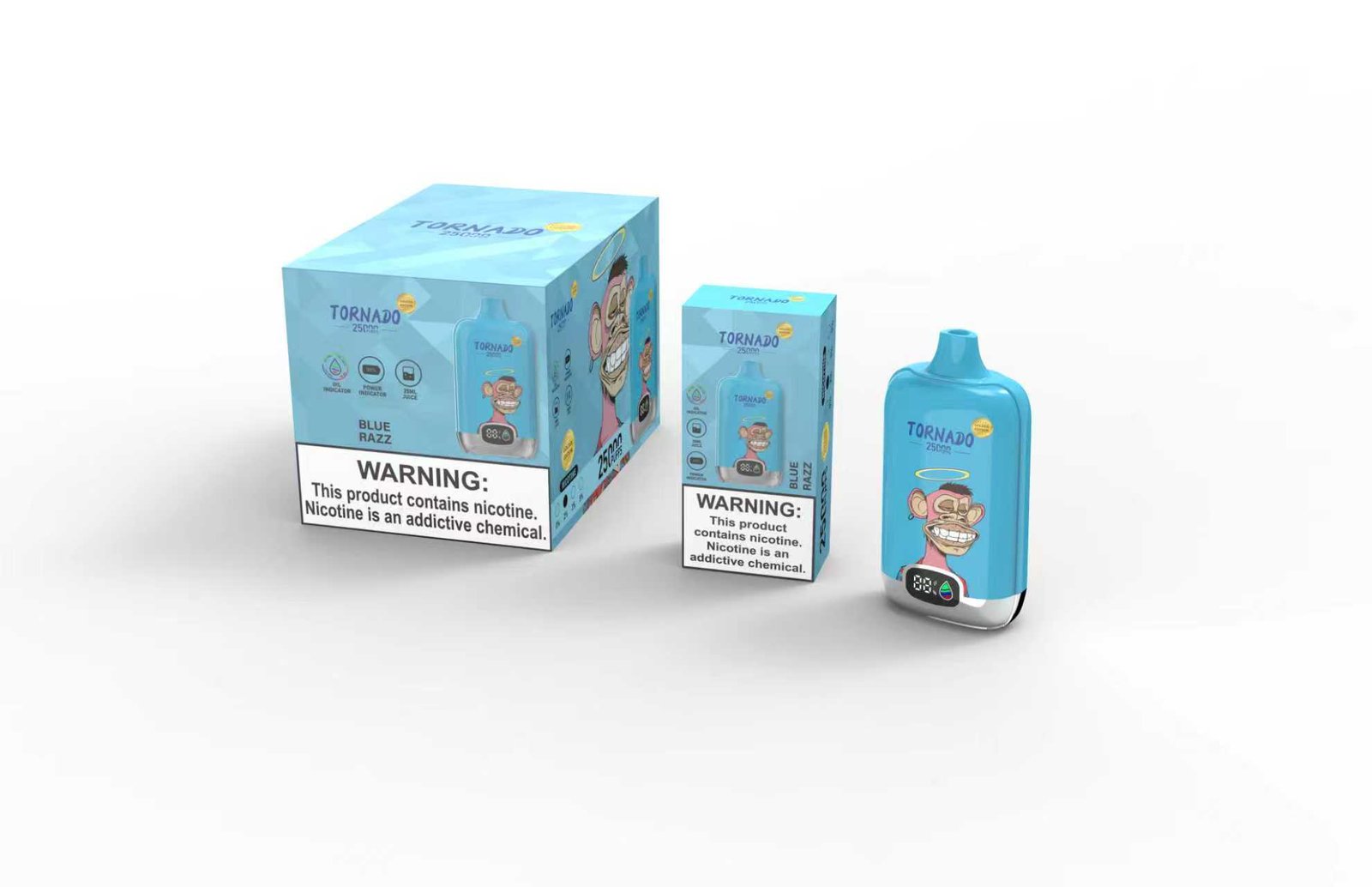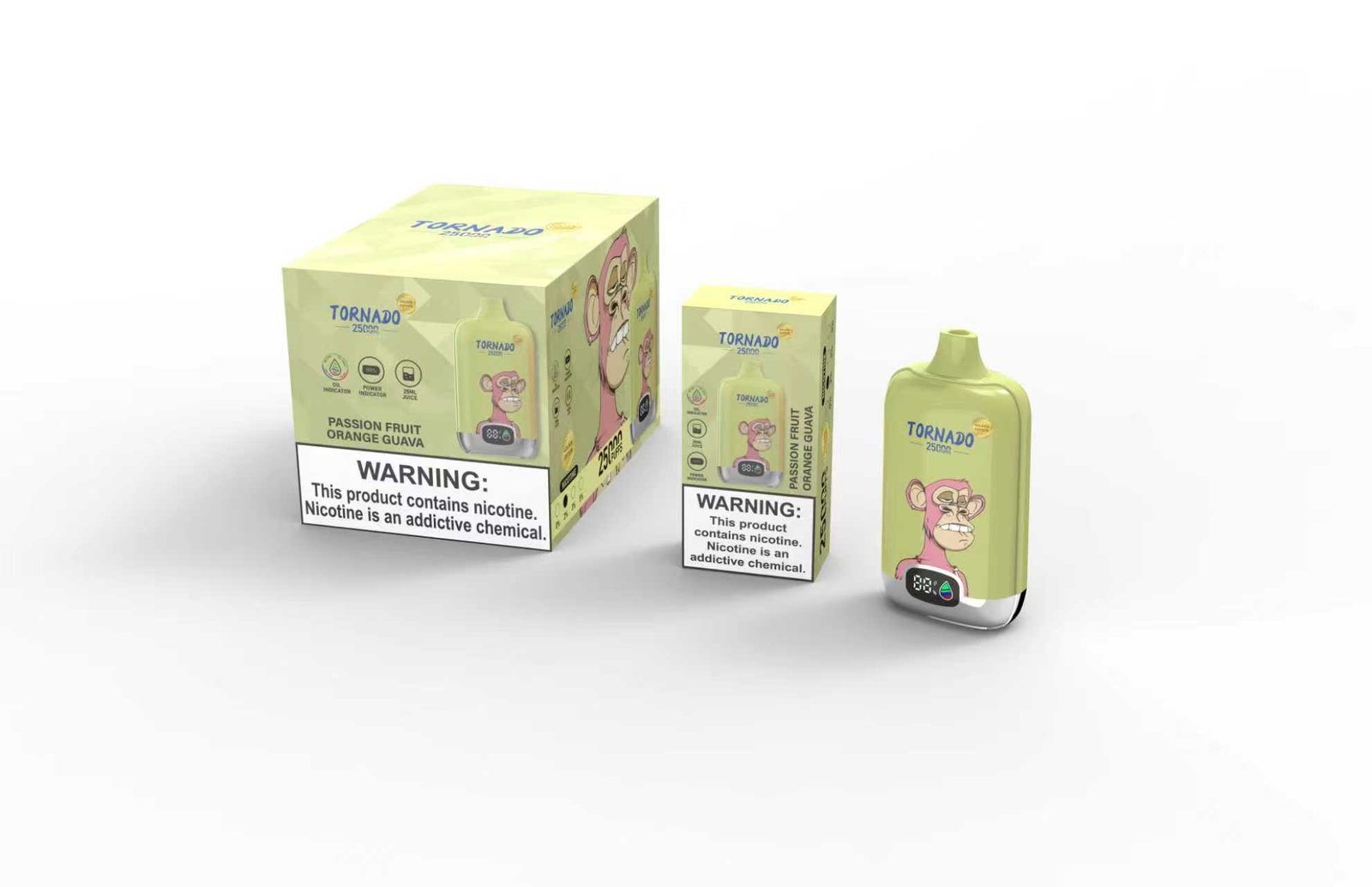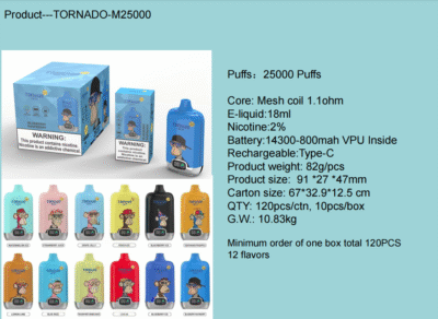 Puffs: 25000 PuffsCore: Mesh coil 1.1ohmE-liquid:18mlNicotine:2%6Battery:14300-800mahVPUInsideRechargeable:Type-CProduct weight: 82g/pcsProduct size: 91 *27 *47mmCarton size:67*32.9*12.5 cmQTY: 120pcs/ctn, 10pcs/boxG.W: 10.83kg